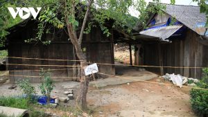 Lực lượng chức năng phong tỏa ngôi nhà của ông Dềnh sau khi tự ý đưa con trai từ khu cách ly về nhà.