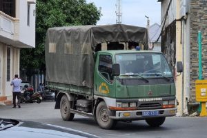 Ô tô công an rời khu vực vào cảng Hà Lộc. Ảnh: Nam Việt